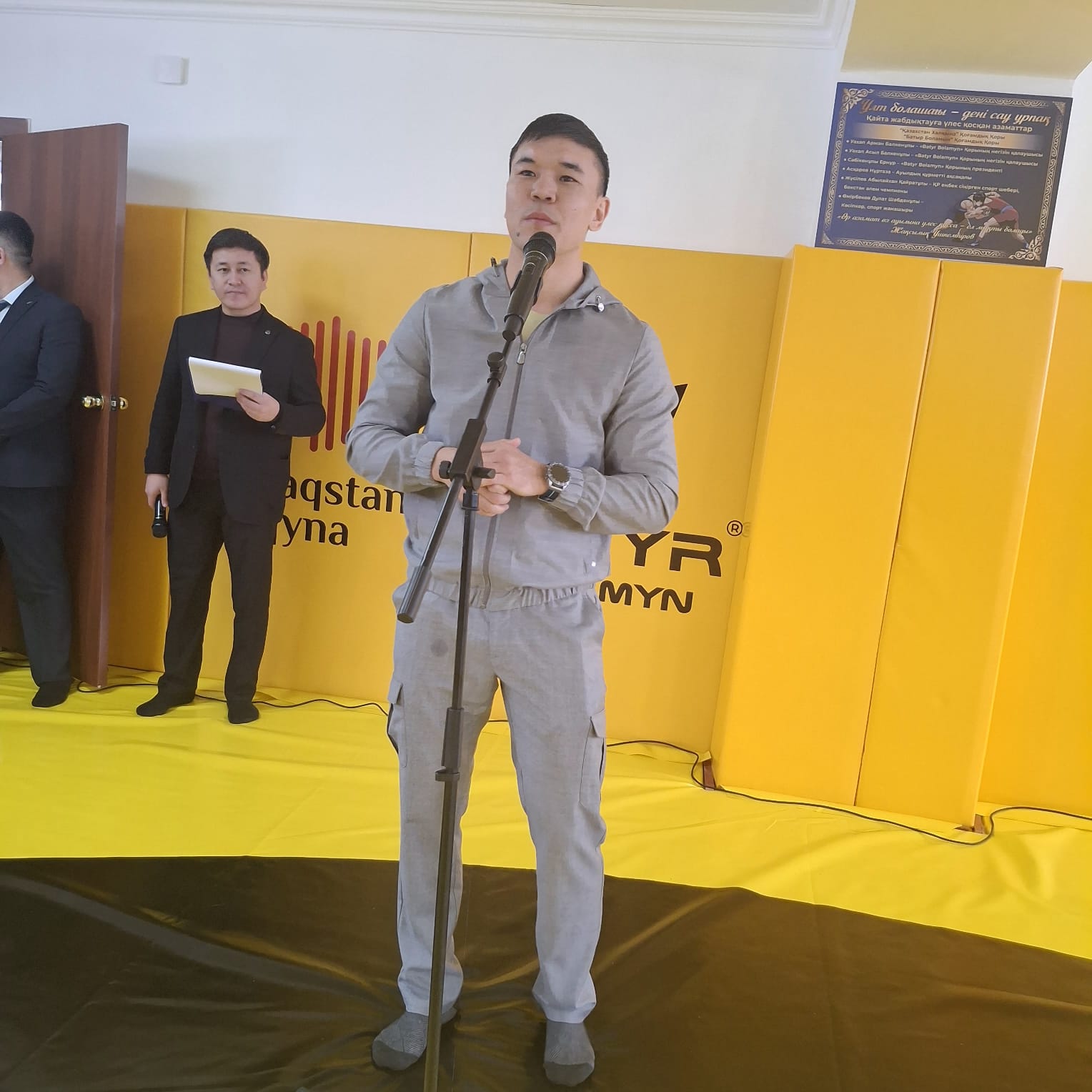 Күрес залының жаңа сипатқа енуіне күш қосқан қор жетекшілеріне және қонақ болып келген спортшыларға қазақы дәстүрмен иықтарына шапан жабылды.