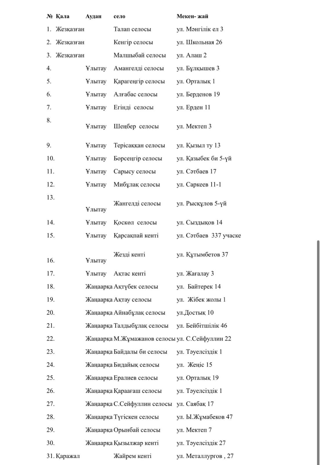 Ұлытау облысы бойынша ашылған «Құқық кабинеттердің» орналасқан мекенжайлары көрсетілген тізімді қоса берілген.